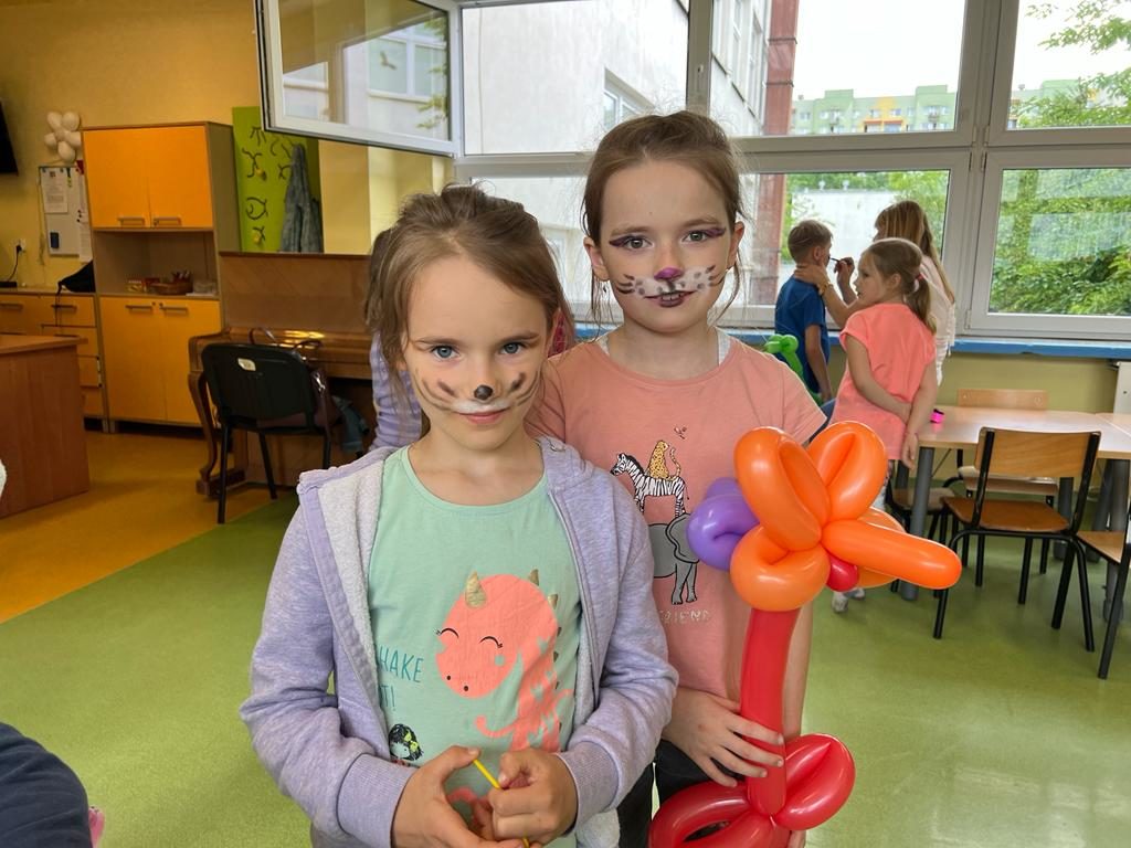 Tegoroczny Dzień Dziecka w szkolnej świetlicy był pełen atrakcji. Było malowanie twarzy, wielkie bańki mydlane, baloniki w przeróżnych kształtach, zabawy z chustą Klanza oraz malowanie kredą na chodniku. Nawet deszcz, który przegonił nas z placu zabaw, nie zepsuł świetnych nastrojów. Większość atrakcji przenieśliśmy pod dach. To był dzień bogaty w bardzo dobre emocje.