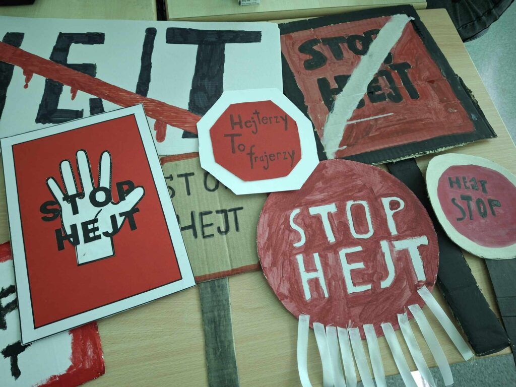 …przypada na 11 lutego, ale jego obchody – w formie realizowanych w całej Polsce lokalnych inicjatyw edukacyjnych – są zaplanowane aż do końca marca. Na lekcji informatyki, w ramach realizacji projektu „STOP HEJT”, uczniowie tworzyli prace wytwórcze z mocnym przekazem do swoich koleżanek i kolegów ze szkoły. Głównym celem podejmowanych działań jest uświadomienie młodych ludzi o groźnych skutkach fali hejtu w Internecie.