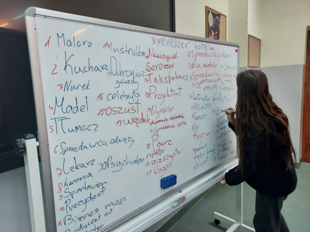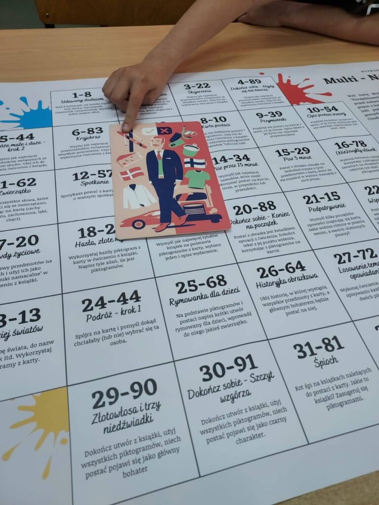 Losujemy pole na macie, wybieramy kartę Multi-Talk I do dzieła! Tym razem uczniowie musieli wymyślić jak najwięcej zawodów, które wykonuje (wykonywała, będzie wykonywać) postać na karcie. Pomocą były piktogramy zamieszczone wokół postaci. Uczniowie stworzyli ponad 50 propozycji.