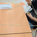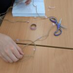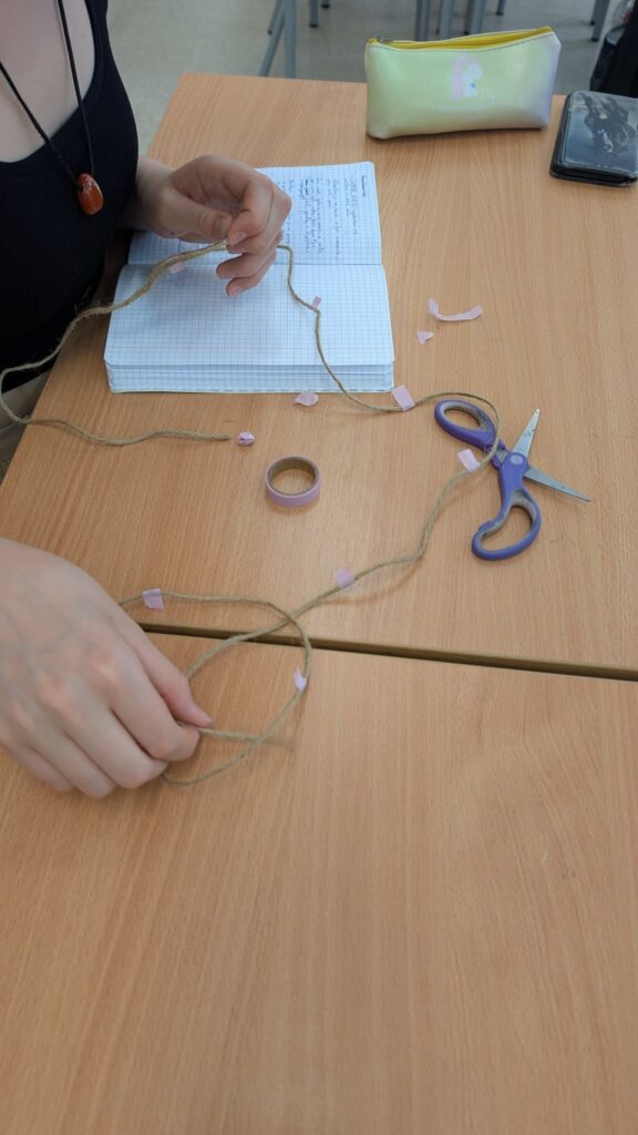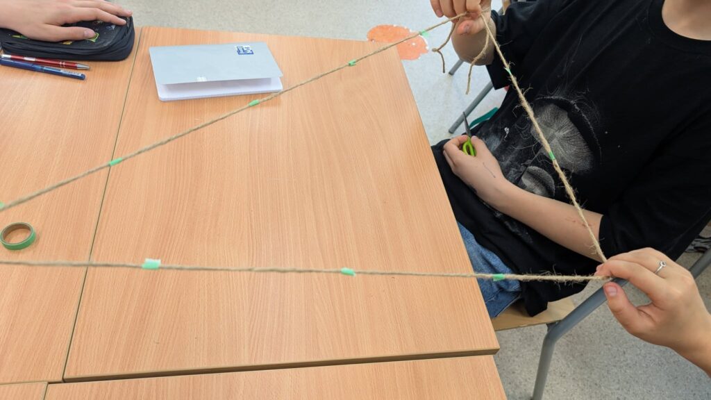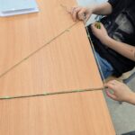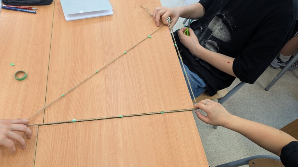Uczniowie zrobili tzw. sznurek egipski, ktory był prostym, ale bardzo skutecznym narzędziem wykorzystywanym przez mierniczych i budowniczych. Składał się z liny zawiązanej w równych odstępach – zwykle co 12 jednostek – tak, by tworzyć trójkąt o bokach długości 3, 4 i 5 jednostek. Taki trójkąt jest prostokątny, co znaczy, że jego kąt między bokami 3 i 4 jednostki ma dokładnie 90 stopni.