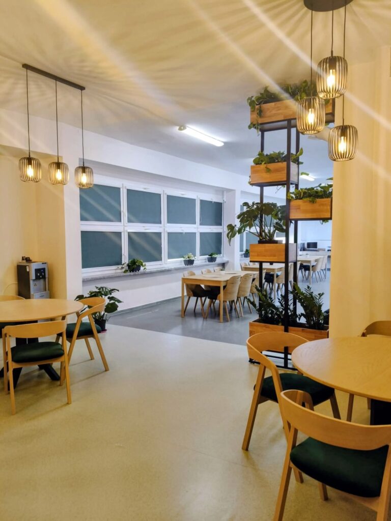 Nauczyciele mogą teraz cieszyć się odświeżoną przestrzenią z wygodnymi sofami i stołami – idealnym miejscem do odpoczynku i spotkań.