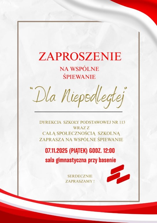 Zaproszenie na wspólne śpiewanie „Dla Niepodległej” – Szkoła Podstawowa nr 113