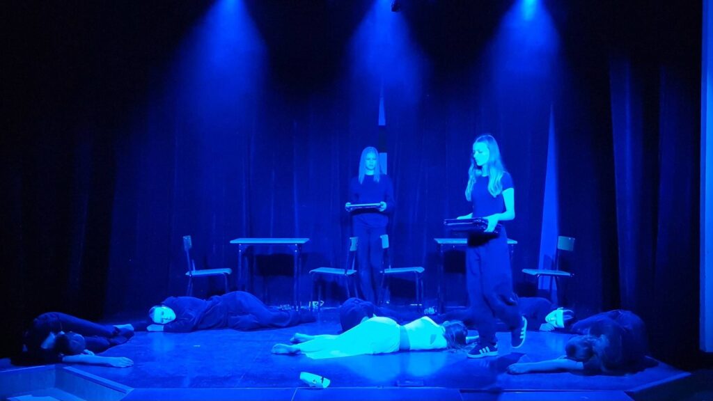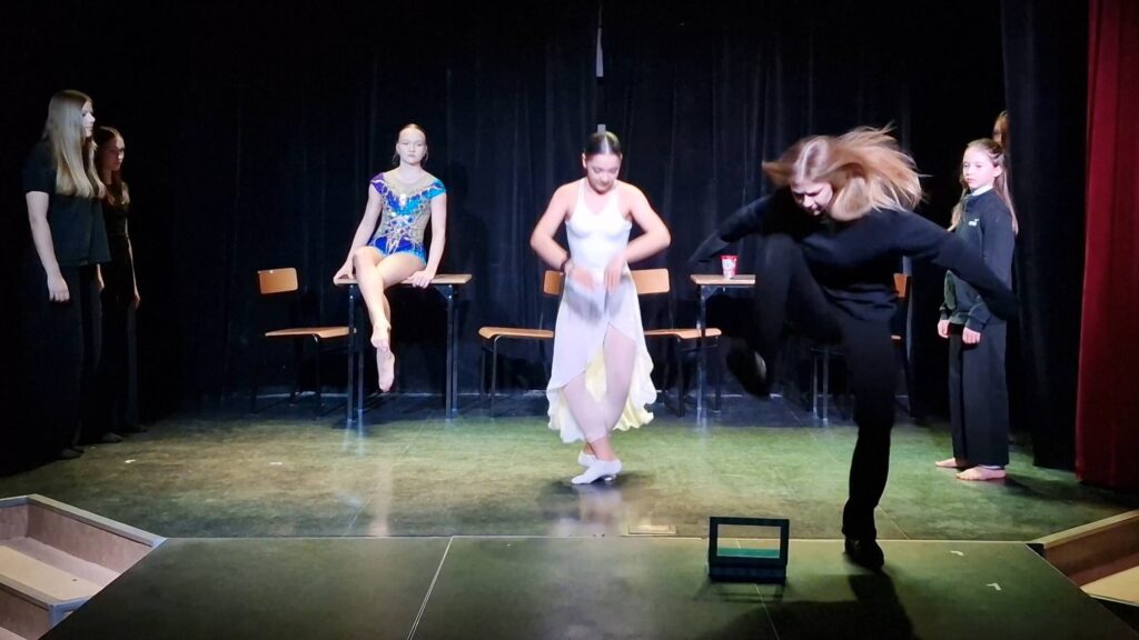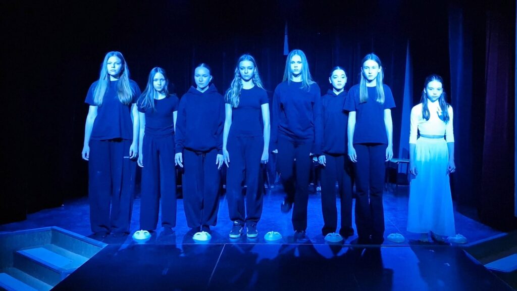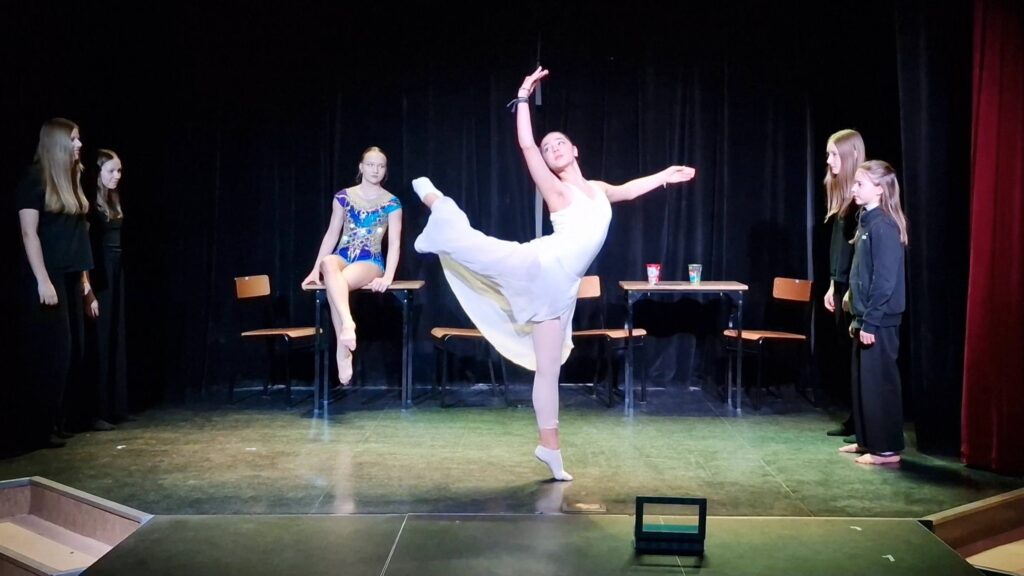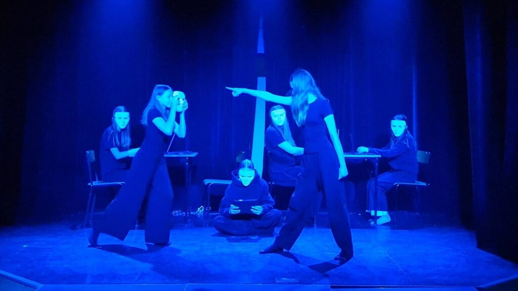 Etiuda teatralna pt.: „Połączenie”, to dynamiczna, niemal mechaniczna etiuda o uzależnieniu od Internetu, mediów społecznościowych i gier, w której nasze młode aktorki wcielają się w role algorytmów i awatarów.
