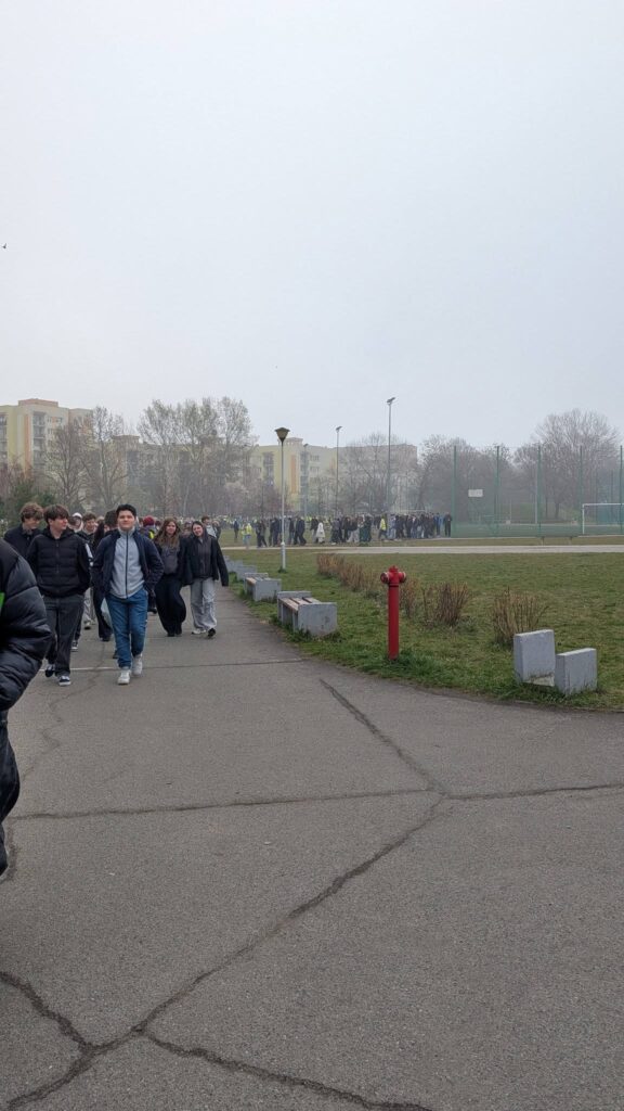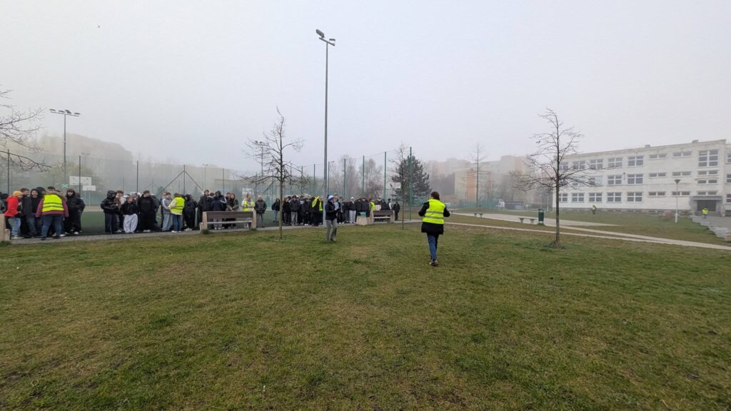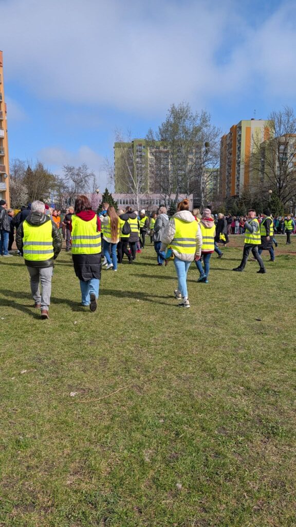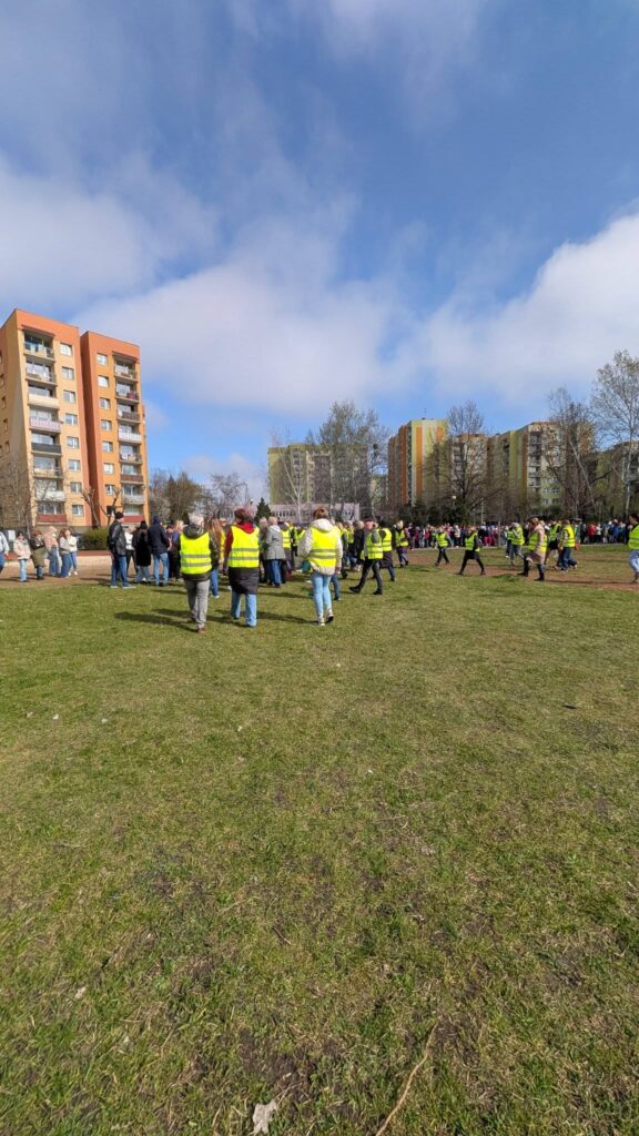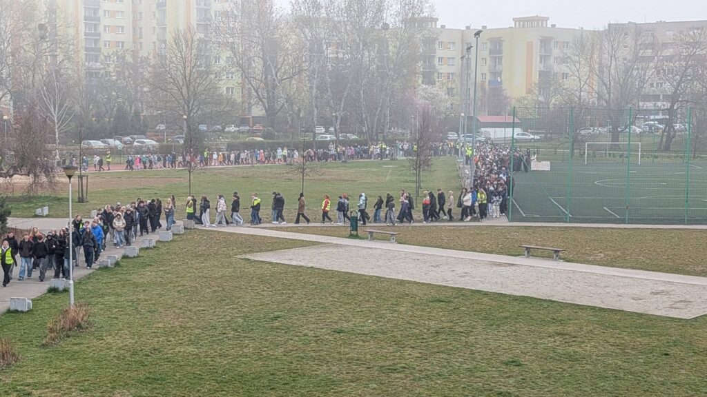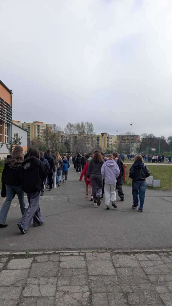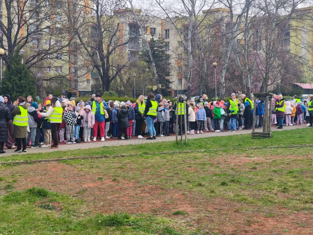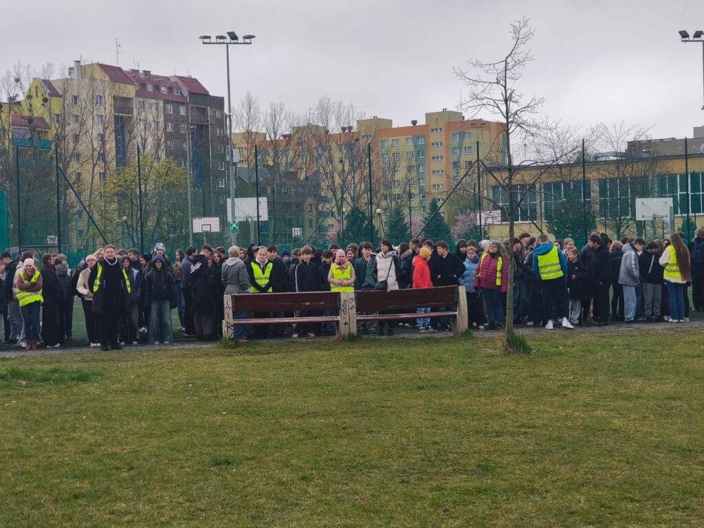 Jak widać na zdjęciach, wszyscy uczniowie, nauczyciele oraz pracownicy obsługi sprawnie i w pełnym porządku wykonali polecenia, gromadząc się w wyznaczonym miejscu zbiórki. Nad prawidłowym przebiegiem ćwiczeń czuwali koordynatorzy w odblaskowych kamizelkach. ????