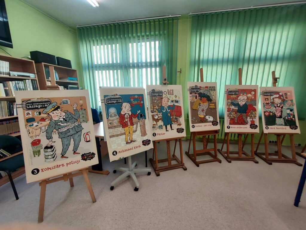 Zajecia przygotowaly panie: Elżbieta Czarny, Ewelina Sambor, Małgorzata Szczepkowicz. Za udostępnienie wystawy portretów bohaterów książek „Biuro detektywistyczne Lassego i Mai” dziękujemy Wydawnictwo Zakamarki